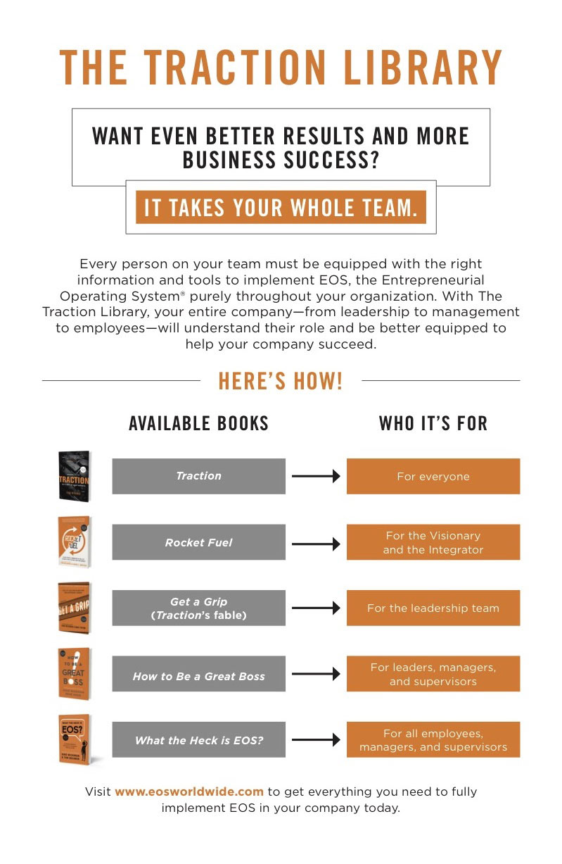 Every person on your team must have the right information and tools to implement the Entrepreneurial Operating System® (EOS) purely throughout your organization. With the books in the Traction Library, your entire company – from leadership to management to employees – will understand their role and be better equipped to help your company succeed.